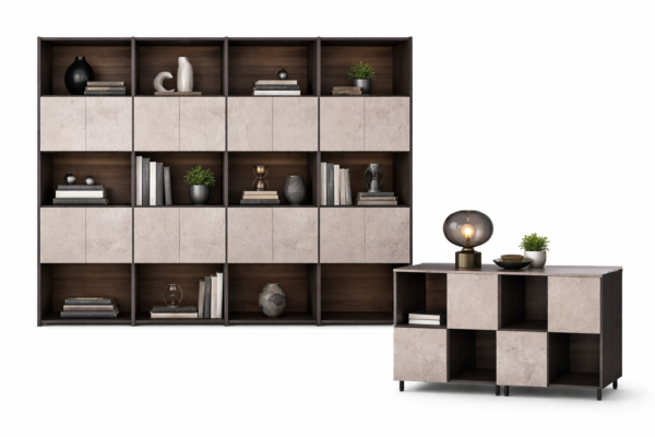 Ένα σύγχρονο modular σύστημα αποθήκευσης που συνδυάζει λειτουργικότητα, αισθητική και αρχιτεκτονική καθαρότητα. Η σύνθεση αποτελείται από ανοιχτά και κλειστά στοιχεία σε απόλυτη ισορροπία, προσφέροντας ευελιξία στη χρήση και υψηλό επίπεδο οργάνωσης.