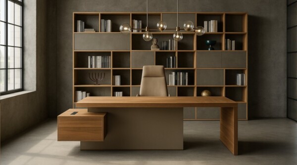 Ο συνδυασμός ανοιχτών ραφιών και κλειστών αποθηκευτικών μονάδων προσφέρει ισορροπία ανάμεσα στην αισθητική προβολή και την οργανωμένη αποθήκευση. Οι ζεστές ξύλινες επιφάνειες δημιουργούν ένα κομψό αποτέλεσμα, ιδανικό για γραφεία, αίθουσες συσκέψεων και σύγχρονους χώρους εργασίας.